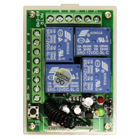 Questo radiocomando wireless permette di controllare 4 carichi elettrici (cancelli automatici, serrature, dispositivi elettrici, etc) tramite i propri 4 relè di uscita (contatti Normalmente Aperto Comune Normalmente Chiuso per ogni uscita). E' fornito con due telecomandi ed è completo di scatola. La centralina si alimenta a 12VDC tramite un comune alimentatore (non fornito).