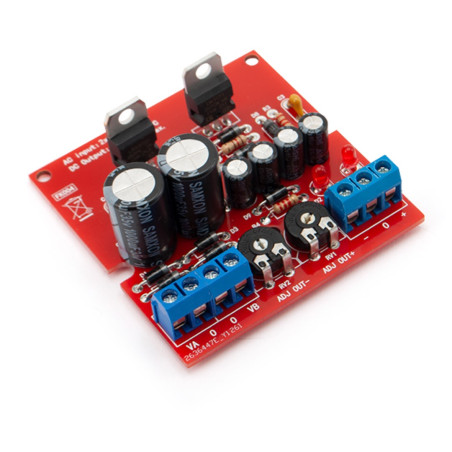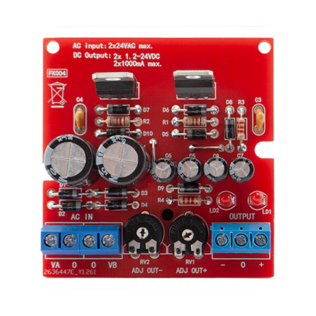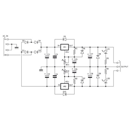 Esta pequeña fuente de alimentación estabilizada dual y regulable, con la adición de un transformador (no incluido, ver productos relacionados) equipado con un grifo central, permite obtener tensiones estabilizadas simétricas de 3 a 15 Vdc y corrientes de 1 A. Se basa sobre el par de reguladores de voltaje complementarios LM317 (para el ramal positivo) y LM337 (para el negativo). Cuenta con dos trimmers para regular los voltajes de salida, dos LED de estado, bloques de terminales de tornillo para entrada y salida de energía. Ideal como aparato de sobremesa, puede constituir la etapa de alimentación de amplificadores BF.