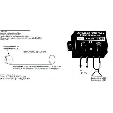ATENCIÓN: Para una potencia máxima de emisión con un efecto disuasorio de 300 m es necesario disponer de un tubo de hierro o plástico con un diámetro de 40 mm y una longitud de 30 cm al que se puede fijar el transductor piezoeléctrico incluido con el producto. Esto permitirá hacer un cañón ultrasónico.