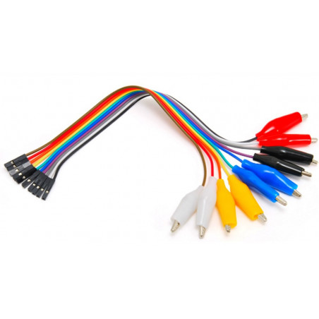 Piattina di 10 cavetti lunghi 20 cm intestati ai capi con connettore femmina a 1 polo da un lato e coccodrillo dall'altro. Ideale per essere impiegato con le piastre sperimentali.