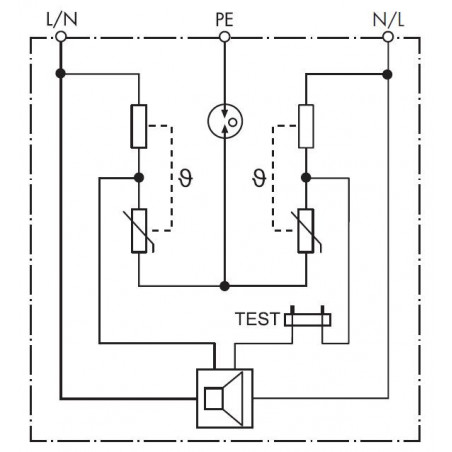 Varistore tra L - N e tra N - PE. Per reti TN-S e TT-reti elettriche. Con segnale acustico nel caso in cui varistore mancanza di tensione. Collegamenti elettrici sono polarità neutra. Dispositivo di test in caso di manutenzione.